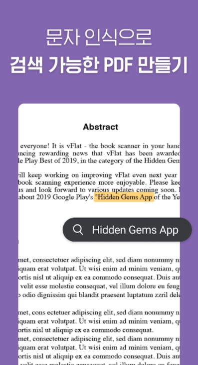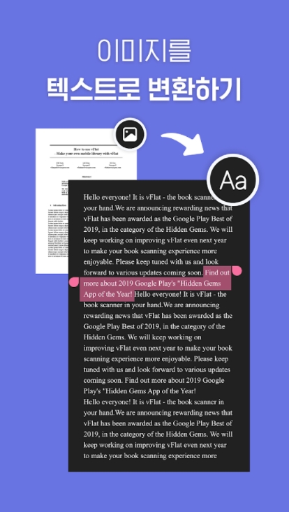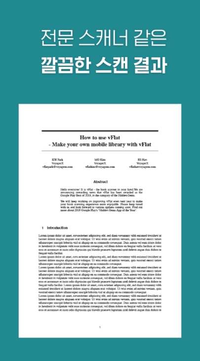 vFlat은 문서, 책, 메모 등 핸드폰으로 촬영한 이미지를 고화질 PDF 또는 JPG 이미지로 만들어주는 스캐닝 앱입니다. vFlat은 문서의 테두리를 자동으로 인식하여 자르고 보정합니다. 또한 촬영한 이미지를 텍스트로 변환하여 원하는 키워드를 검색하거나 복사할 수 있습니다.