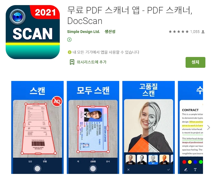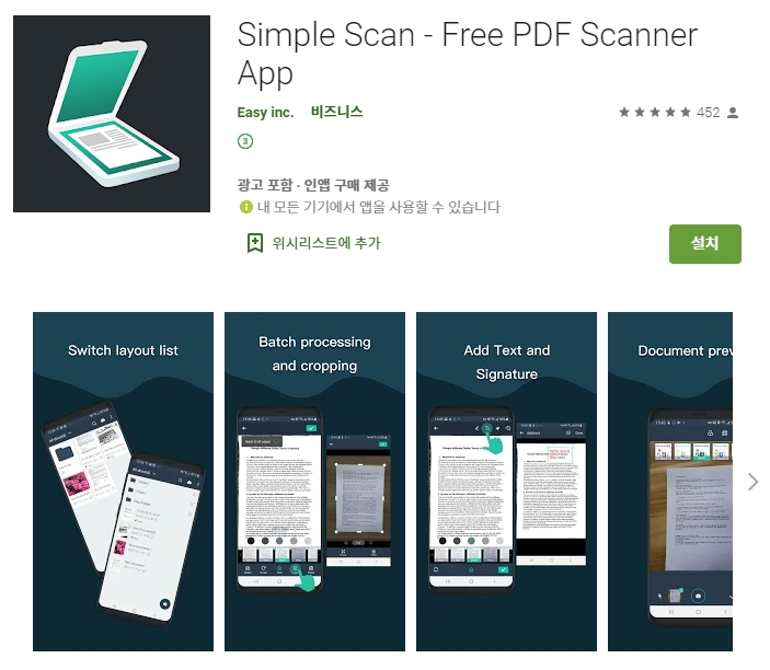 다섯 번째 소개할 어플은 Simple Scan (문서 스캔) 어플입니다. 이름처럼 간편하게 스캔할 때 유용합니다. 아래는 Simple Scan (문서 스캔) 어플에 대한 자세한 설명이니 참고하세요~