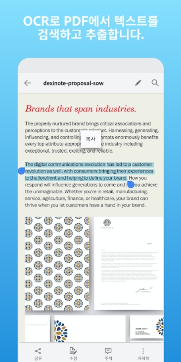 • 자동 OCR 기능을 사용하면 텍스트가 다른 문서에서 편집하고 크기를 조정하고 재사용할 수 있는 콘텐츠로 변환됩니다.
