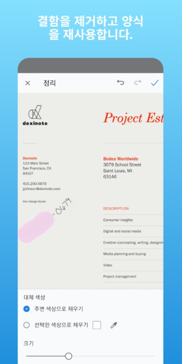 • 명함을 스캔하면 Adobe Scan이 빠르게 명함 스캐너와 리더기로 바뀝니다.