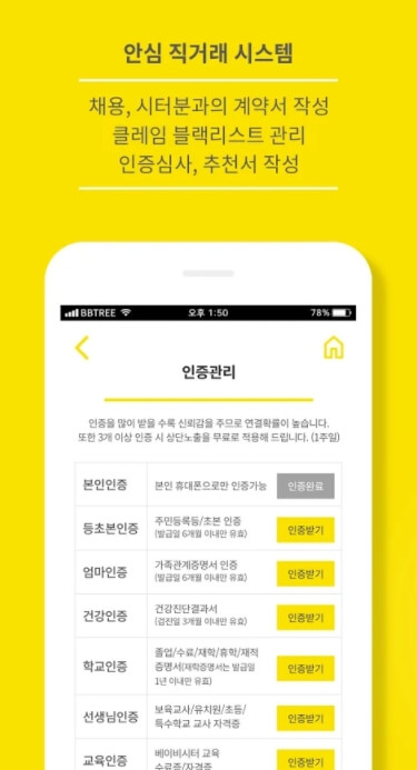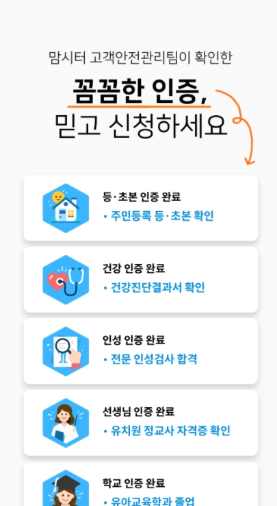 - 고객안전관리팀이 꼼꼼하게 확인한 인증들을 확인해보세요. (건강/인성/자격증/등초본/학교/육아 경험 등)