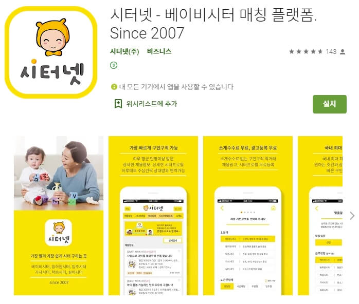 이번 소개할 어플은 시터넷 (베이비시터 구인 구직) 어플입니다. 매칭 수수료가 없습니다. 무료로 베이비시터를 구하고자 하시는 분들에게는 강추합니다. 아래는 시터넷 (베이비시터 구인 구직) 어플에 대한 자세한 설명이니 참고하세요~