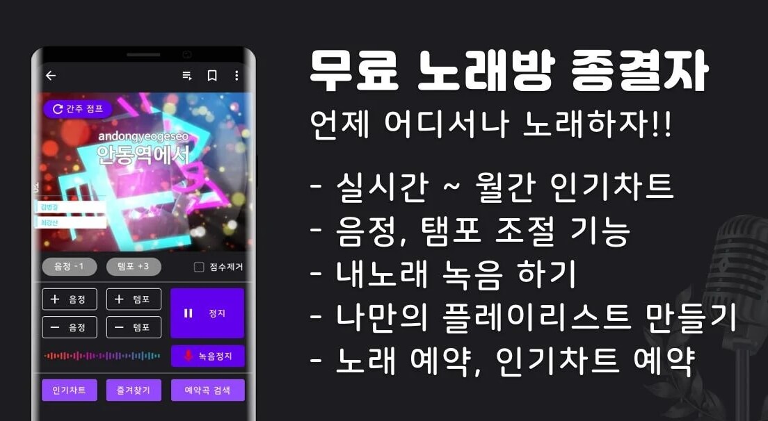 녹음/키 조절/점수/무료 노래방/무료 음악 듣기/코인 노래방 전부 지원합니다! 심지어 동요 까지!!