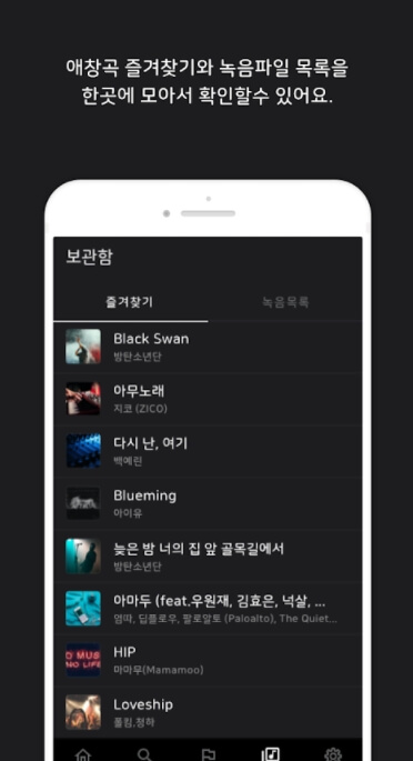애창곡 즐겨찾기와 녹음파일 목록을 한 곳에 모아서 확인할 수 있어요.
