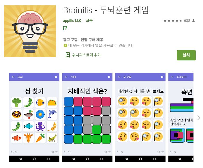 세 번째 소개할 어플은 Brainilis (두뇌훈련 게임) 어플입니다. 치매예방 두뇌훈련을 할 수가 있습니다. 아래는 Brainilis (두뇌훈련 게임) 어플에 대한 자세한 설명이니 참고하세요~