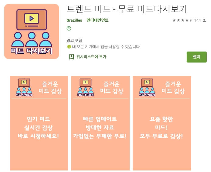 첫 번째 소개할 어플은 트렌드 미드 (무료 미드 다시 보기) 어플입니다. 미드를 좋아하신다면 추천드립니다~. 아래는 트렌드 미드 (무료 미드 다시 보기) 어플에 대한 자세한 설명이니 참고하세요~