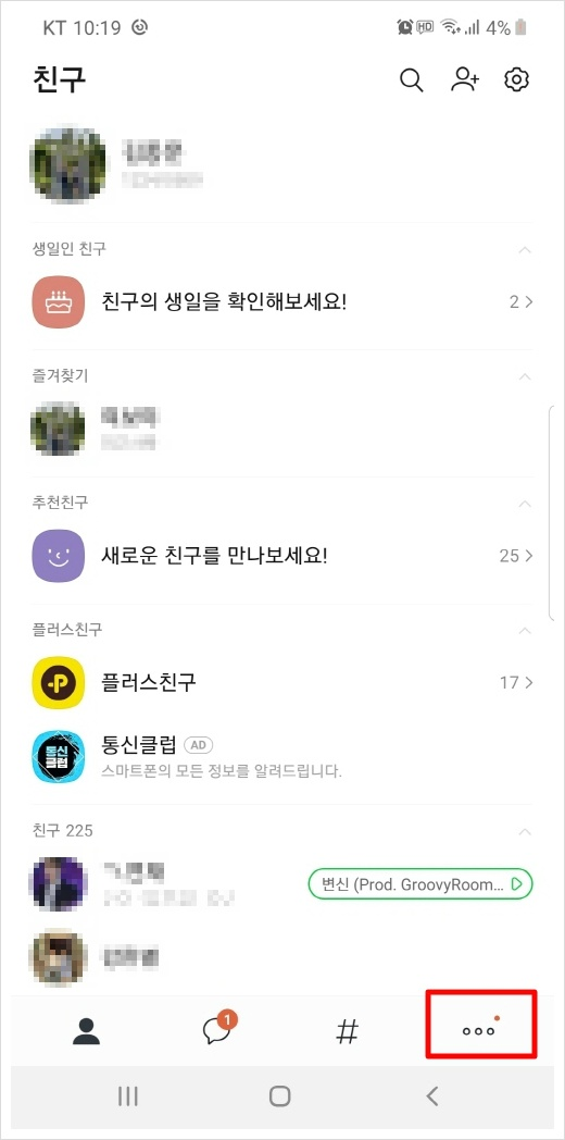 ▲ 카카오톡을 여셨다ㅏ면 우측하단의 점세개 아이콘이 보일겁니다. 더보기 아이콘이라고 하죠~ 이것을 눌러주세요~