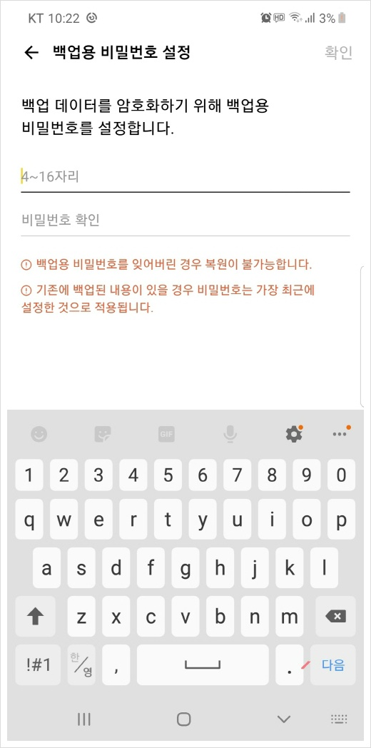 ▲ 대화 백업 버튼을 누르시면 위와같이 비밀번호 입력하는 화면이 나옵니다. 자신만 알수있는 비밀번호를 넣어주시면 됩니다. 이 비밀번호는 복원할때 꼭 필요하니 잊어버리면 안됩니다. 비밀번호는 수첩이나 메모장에 기록해 놓으시면 안심이 되겠죠~