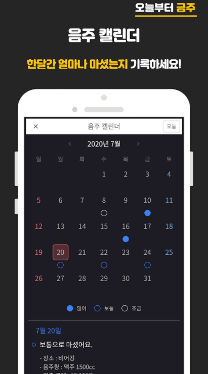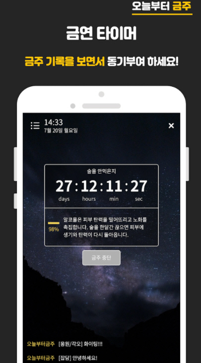 - 첫 화면에서 금주 기록을 확인하여 마음을 다잡으세요.