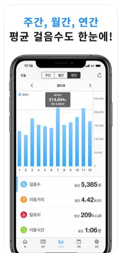 ・주간, 월간, 연간 걸음수, 소비 칼로리, 이동거리, 이동시간을 볼 수 있습니다.