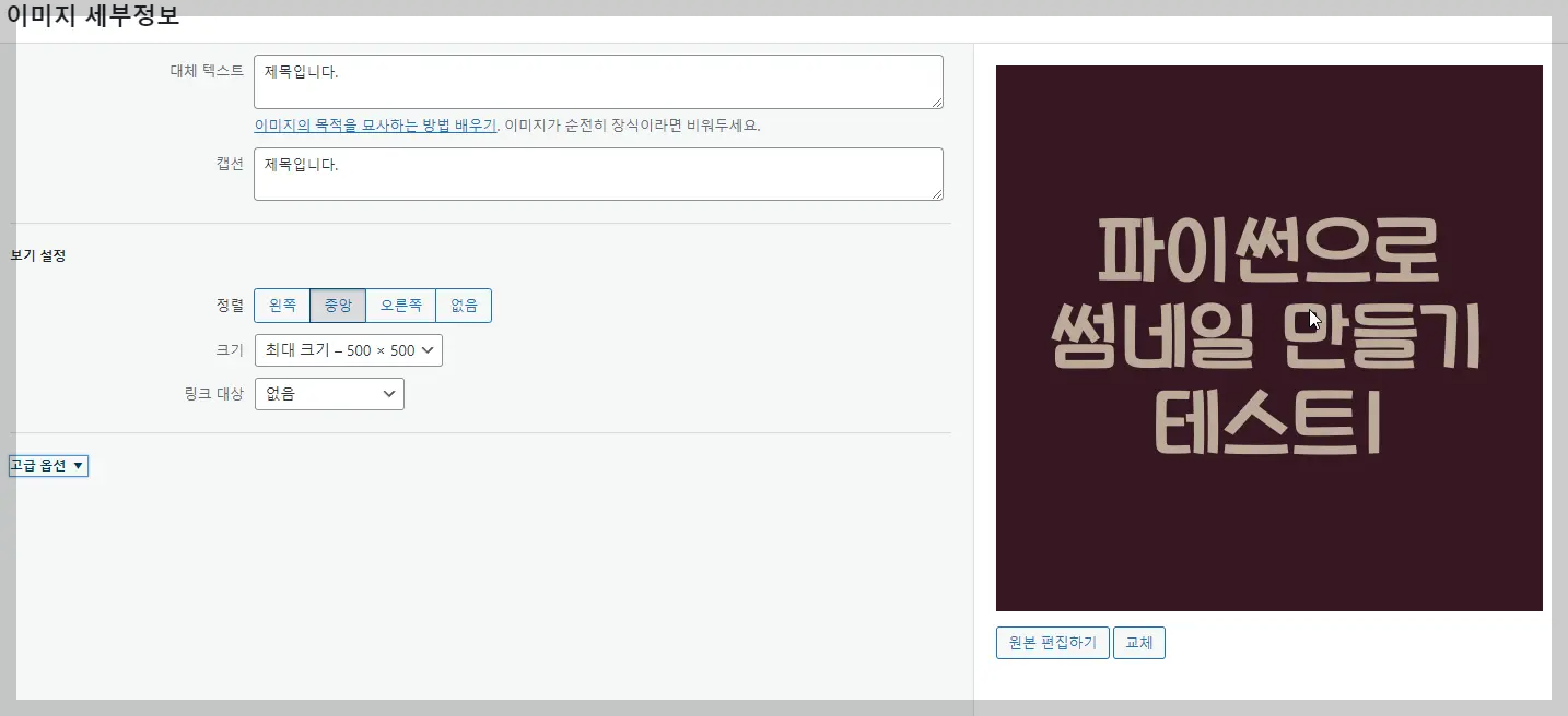 첨부한 이미지 세부정보도 확인해보니 대체텍스트와 캡션 그리고 이미지 크기 까지 제대로 적용된것을 확인할수가 있었습니다.