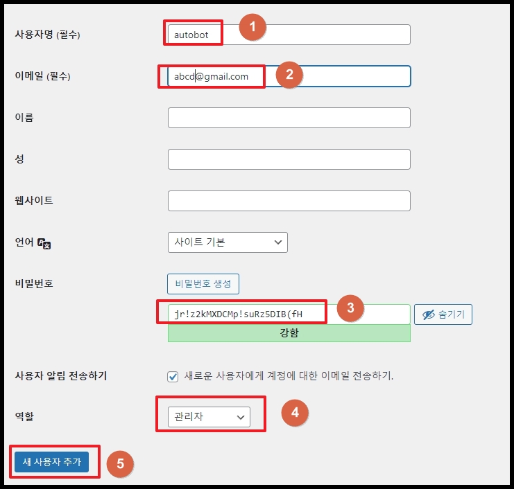 워드프레스 관리자 화면에서 사용자 클릭후 새로추가를 클릭해주세요.