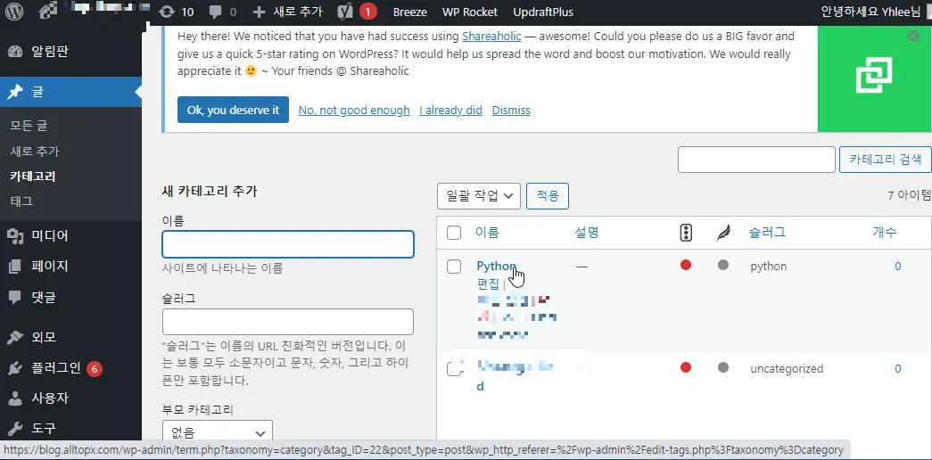 워드프레스 관리자화면에서 글 - 카테고리를 클릭하시면 모든 카테고리 리스트가 나옵니다. 카테고리 중 하나에 마우스 커서를 올려놓으면 하단에 URL 이 뜹니다.