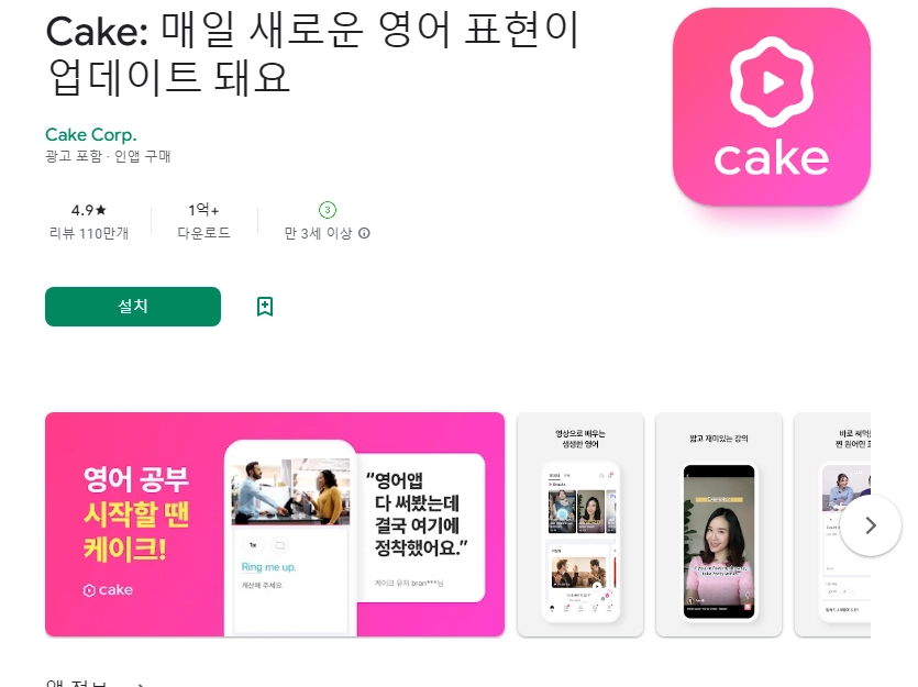 이 어플은 구글플레이스토어에서 "영어 공부"로 검색했을때 2번째로 나오는 어플입니다. 아래는 Cake: 매일 새로운 영어 표현이 업데이트 돼요 어플에 대한 자세한 설명이니 참고하세요.