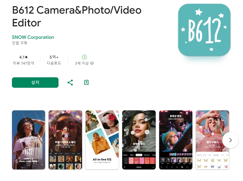 이 어플은 구글플레이스토어에서 "카메라"로 검색했을때 2번째로 나오는 어플입니다. 아래는 B612 Camera&Photo/Video Editor 어플에 대한 자세한 설명이니 참고하세요.
