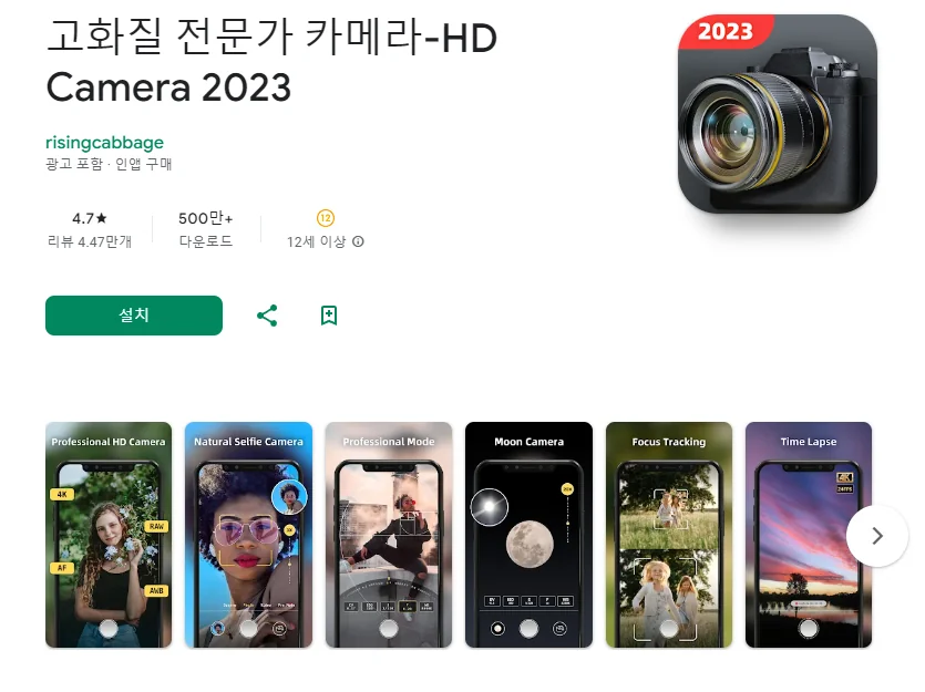 이 어플은 구글플레이스토어에서 "카메라"로 검색했을때 5번째로 나오는 어플입니다. 아래는 고화질 전문가 카메라-HD Camera 2023 어플에 대한 자세한 설명이니 참고하세요.