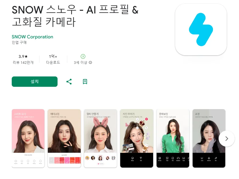 이 어플은 구글플레이스토어에서 "카메라"로 검색했을때 1번째로 나오는 어플입니다. 아래는 SNOW 스노우 - AI 프로필 & 고화질 카메라 어플에 대한 자세한 설명이니 참고하세요.