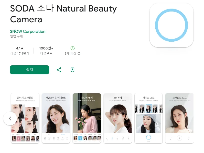 이 어플은 구글플레이스토어에서 "카메라"로 검색했을때 4번째로 나오는 어플입니다. 아래는 SODA 소다 Natural Beauty Camera 어플에 대한 자세한 설명이니 참고하세요.