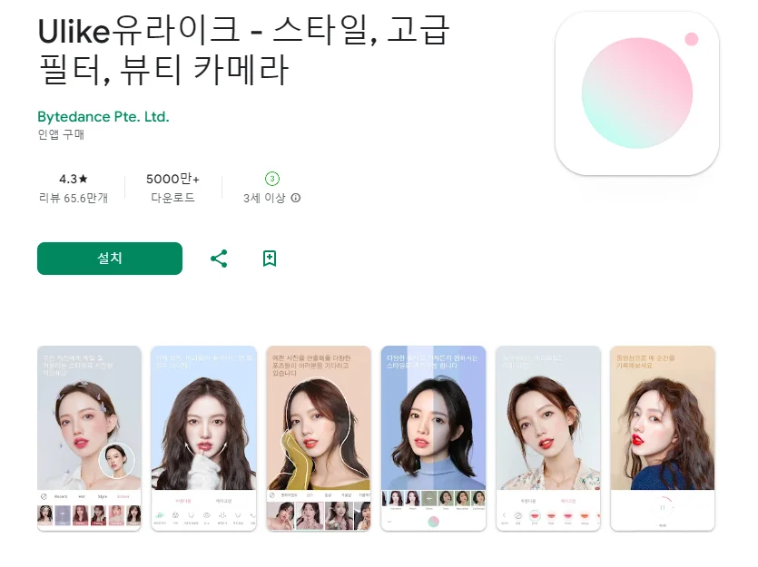 이 어플은 구글플레이스토어에서 "카메라"로 검색했을때 3번째로 나오는 어플입니다. 아래는 Ulike유라이크 - 스타일, 고급 필터, 뷰티 카메라 어플에 대한 자세한 설명이니 참고하세요.