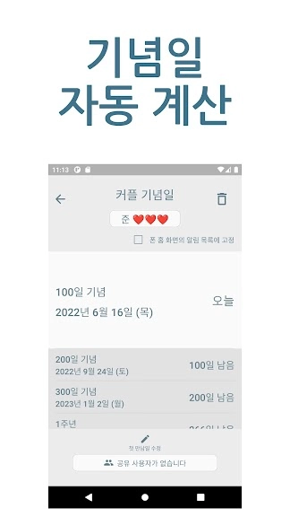 100일, 200일은 물론 1주년, 2주년도 손쉽게 확인하세요.
