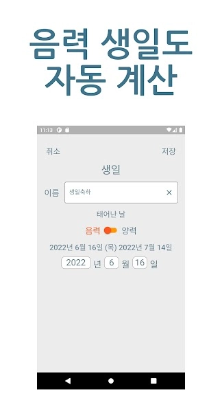 음력 생일도 간편하게 관리합니다. 음력달력 뒤져가며 매년 날짜계산 하고 캘린더 달력에 기록할 필요가 없습니다.