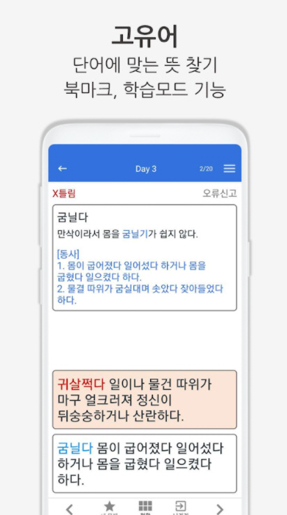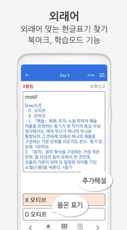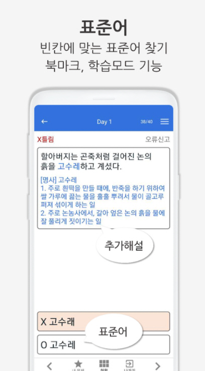 - 표준어, 외래어, 사자성어, 한자어, 고유어 어휘 학습을 할 수 있습니다.