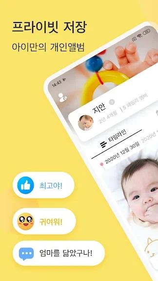 ▶ 어플이 매우 스마트합니당 폰에서 촬영된 시간에 따라서 사진이 자동으로 분류돼요. 손으로 하나하나 분류할 필요가 없어요 또 사진이나 동영상을 올리면 멀리있는 친척이나 친구들도 아기사진을 볼 수 있어서 좋아요! 짱!!!