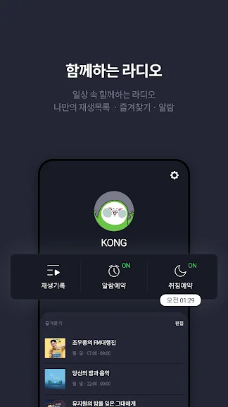 - "함께하는 라디오" 일상 속 함께하는 라디오! 나만의 재생목록, 즐겨찾기, 알람 등 편의 기능과 함께하세요.