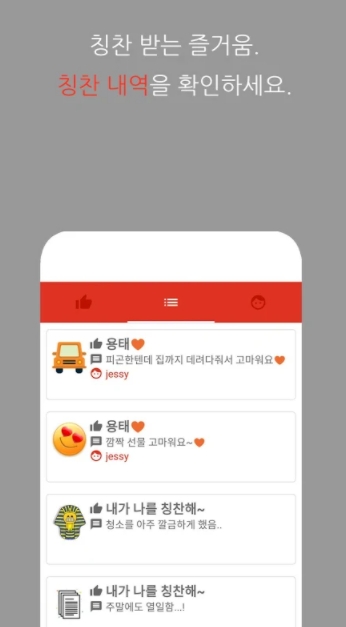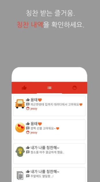 ▶ 개발자님 좋은 어플 개발해주셔서 너무 감사합니다! 유용하게 잘 쓰고 있어요. 혹시 상대방이 칭찬해준 내용에 댓글 달 수 있는 기능도 추가해주실 수 있나요? 밑에 다른 분이 말씀하신 알림 기능도 보완되면 좋을 것 같습니다. 감사해요~