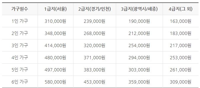 - 소득인정액 기준은 중위소득의 50% 이하이며, 가구원에 따른 금액은 아래와 같습니다.