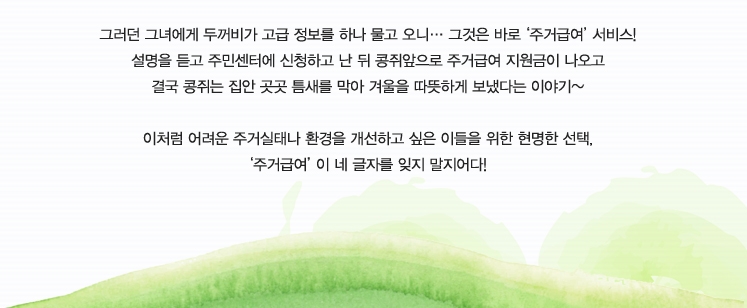 - 임차가구는 전월세비용을 지원하고, 자가가구는 낡은 집을 고쳐드립니다.