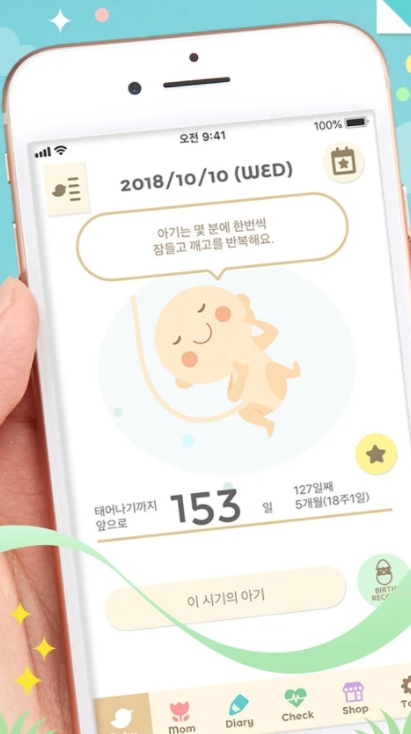임신 주수에 따라 성장하는 아기의 일러스트는 앱을 열 때마다 귀여운 몸짓을 다양하게 보여줍니다. 아기를 탭하면 말을 합니다. 이 대사는 매일 바뀌면서 아기의 모습이나 응원 메시지를 전해줍니다.