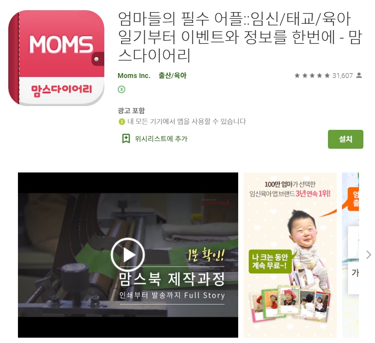 두 번째 소개할 어플은 맘스다이어리 (임신/태교/육아일기) 어플입니다. 100만 엄마가 선택한 임신육아 어플 브랜드 3 년년 연속 1위 어플이죠~ 아기의 성장일기를 앨범으로 만들어서 출판하는 재미가 있습니다. 나중에 아기가 자랐을 때 아주 큰 선물이 되겠죠~ 지금 여러 가지 할인 이벤트도 많이 하고 있으니 꼼꼼히 둘러보시고 혜택 누리시기 바랍니다~ 아래는 맘스다이어리 (임신/태교/육아일기) 어플에 대한 자세한 설명이니 참고하세요~