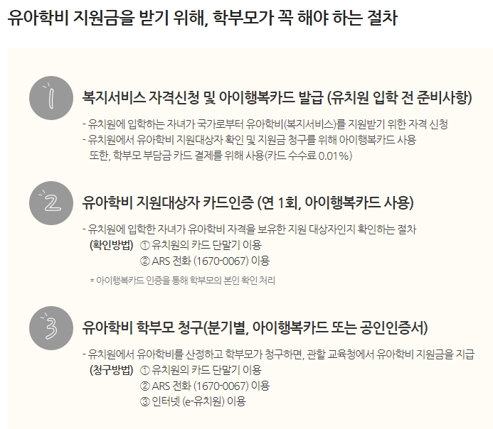 - 유치원을 이용하는 경우에만 유아학비가 지원됩니다.