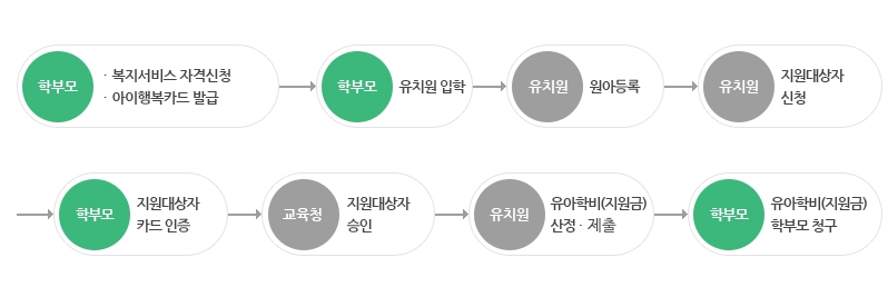 ※ 보호자의 자격 신청일을 기준으로 지원하고(소급지원 불가), 지원금 산정은 유아학비와 동일하게 ‘교육일 수’에 따름