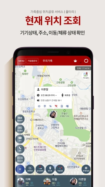 실시간으로 이동하는 상황을 조회할 수 있으며 데이터가 꺼져 있을 때도 SMS를 이용해 현재 위치를 확인할 수 있습니다.