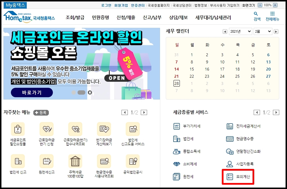 ▲ 그러면 위와 같이 홈텍스 홈페이지가 열릴 겁니다. 우측 아래쪽에 모의계산이라는 글자가 보일 거니다. 클릭해주세요~