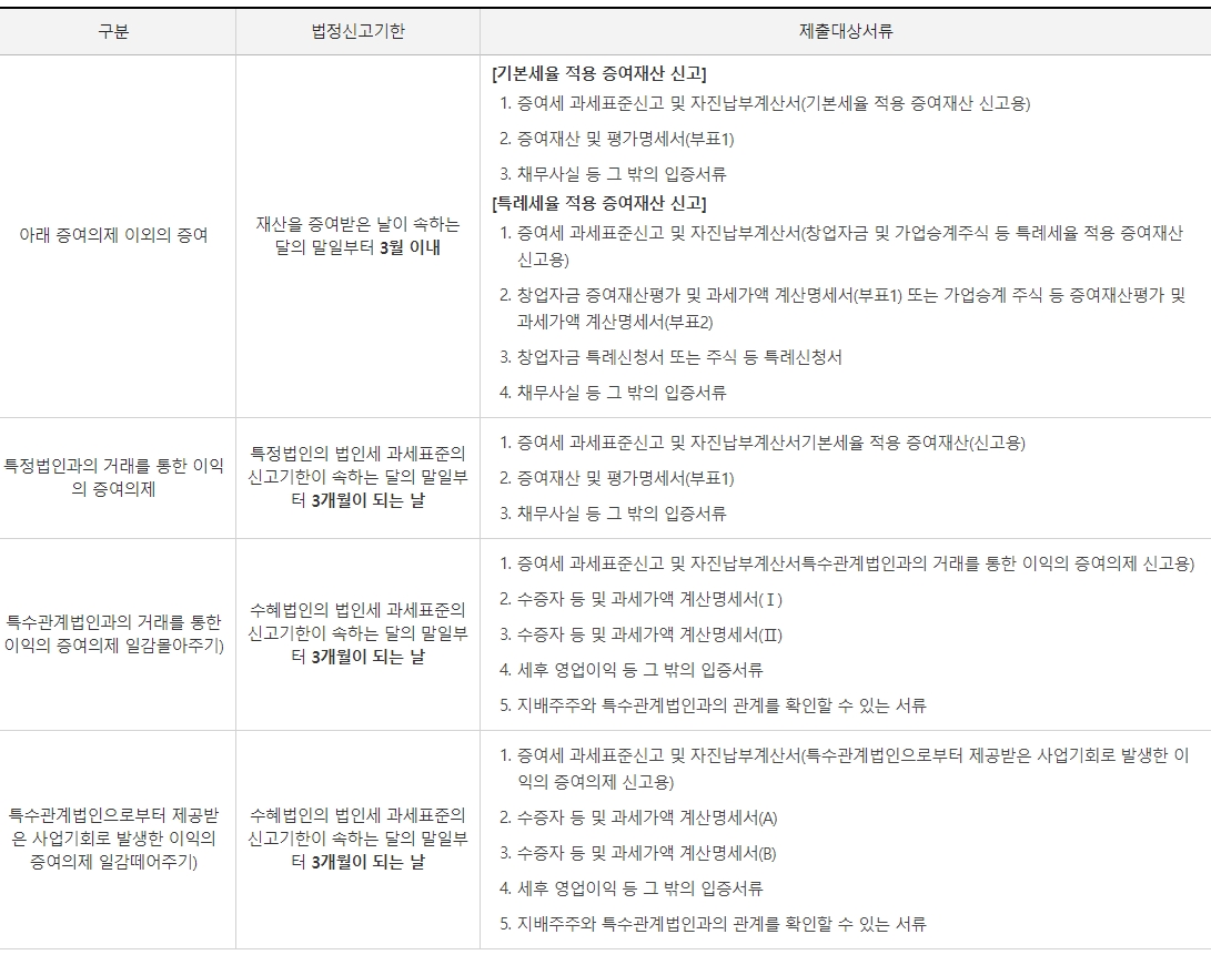 ※ 증여세의 신고기간은 증여받은날이 속하는 달의 말일부터 3개월 이내에 신고하시면 됩니다. 제출서류는 아래 표를 참고해주세요~