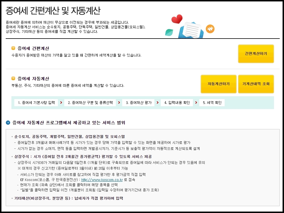 ▲ 그러면 위와같은 화면이 나올겁니다. 증여받은 재산의 가액을 알고 있을 때에는 "간편 계산하기" 메뉴를 이용해서 편리하게 세액계산을 할 수가 있습니다. 가액을 모른다면 "자동 계산하기" 메뉴를 이용해서 부동산이나 주식 등의 증여세를 계산하실 수가 있습니다.