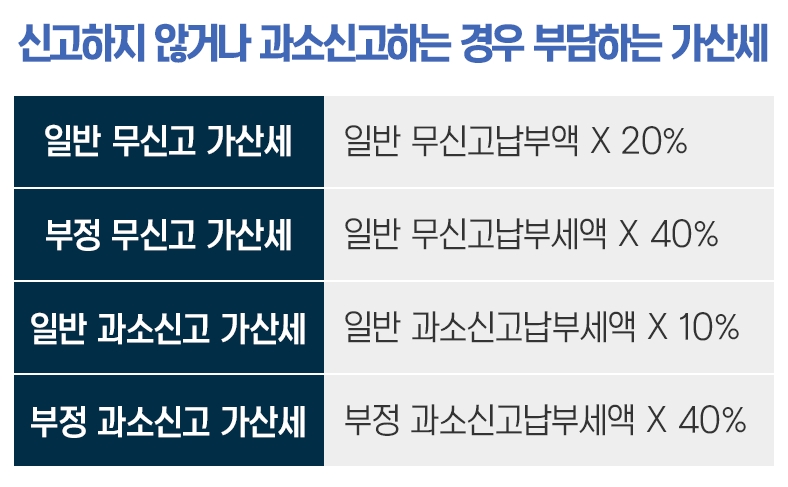 만약 신고하지 않거나 과소신고하는경우에는 가산세가 붙게 되니 기간 내에 정직하게 신고하는 것을 추천드립니다. 아래는 가산세를 정리한 표니 참고하세요~