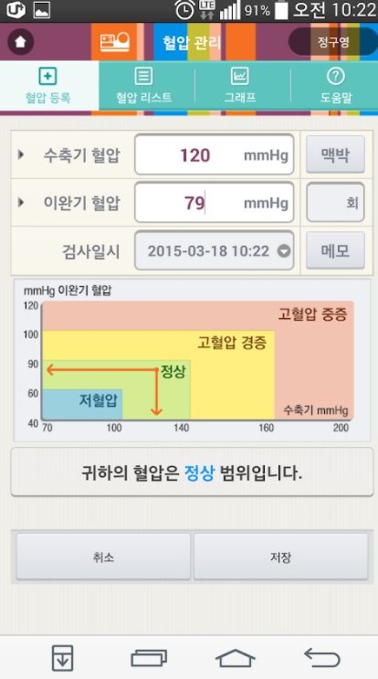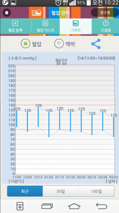 - 혈압을 기록 관리하고 누적된 혈압 결과를 그래프로 보여주어 혈압 변화를 평가하는 메뉴입니다.