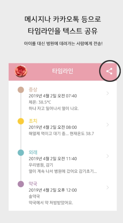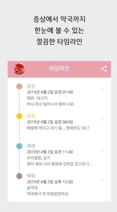 #증상부터 약국 처방까지의 과정을 타임라인으로 한눈에 확인할 수 있습니다.