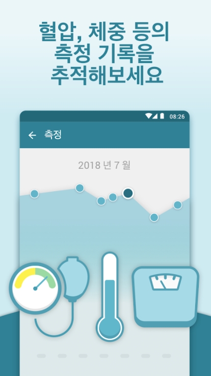 • 체중, 혈압, 혈당치 등을 측정한 후 기록할 수 있어 대부분 병들 (당뇨병, 류머티즘성 관절염, 우울증, 고혈압 등)에 대한 체계적 관리 가능