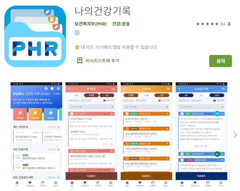 네 번째 소개할 어플은 나의 건강기록 어플입니다. 아래는 나의건강기록 어플에 대한 자세한 설명이니 참고하세요~