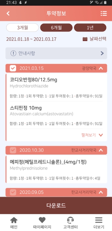 병원(약국)에서 조제받은 최근 1년간의 의약품 투약 내역 조회