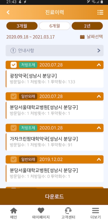 의료기관 및 약국을 방문한 최근 1년간의 진료 내역 조회