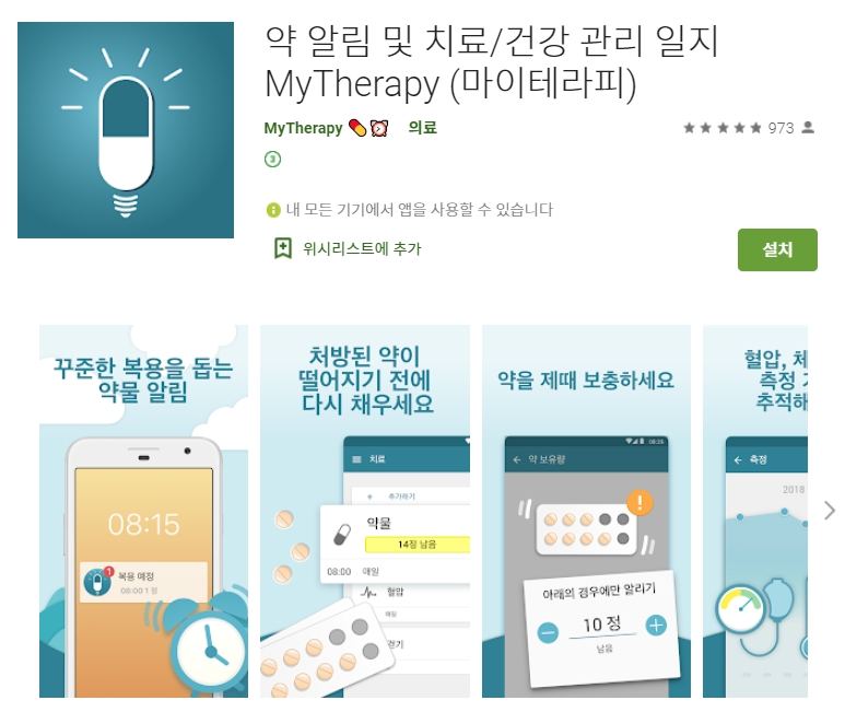 다섯 번째 소개할 어플은 약 알림 및 치료(건강 관리 일지) 어플입니다. 아래는 약 알림 및 치료(건강 관리 일지) 어플에 대한 자세한 설명이니 참고하세요~