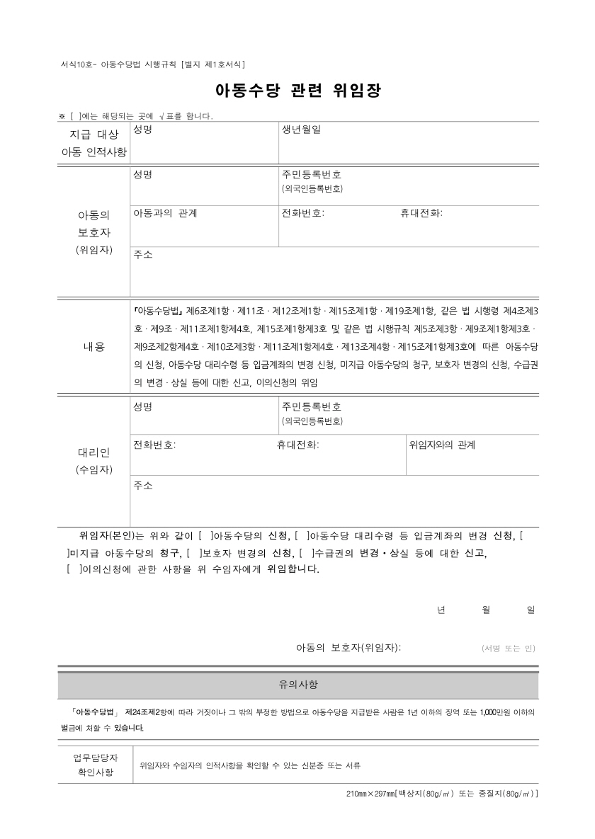 대리 신청 시 : 『아동수당 관련 위임장』 , 아동의 보호자 및 대리인 신분증