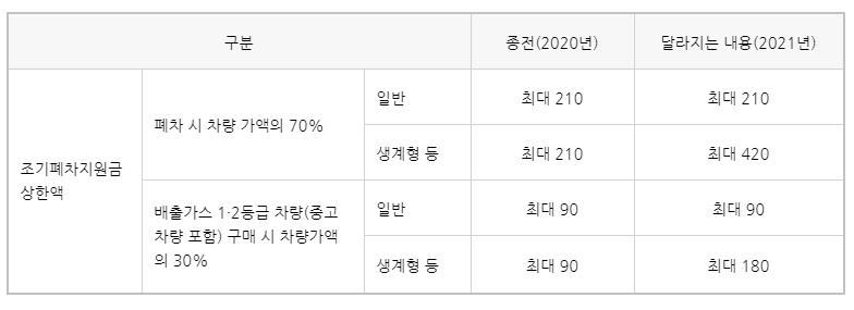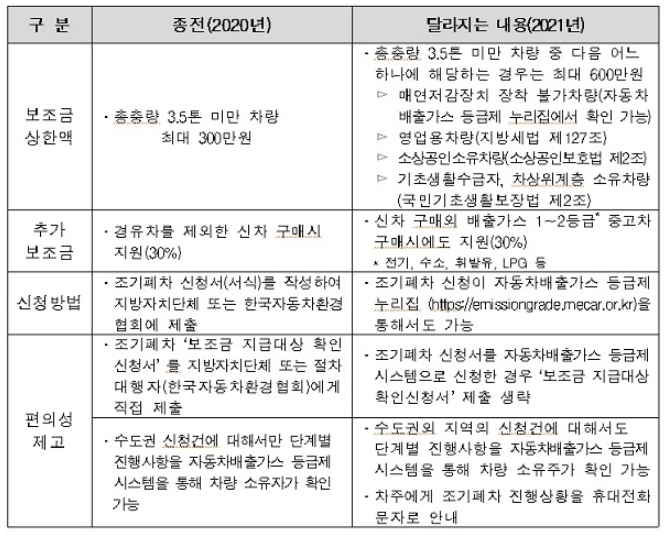 조기폐차 지원금은 당초 보험개발원에서 산정한 기준가액의 70%(최대 210만 원)를 지원하고 경유차 외 신차 구매 시 30%(최대 90만 원)의 추가보조금을 지원하는 것입니다. 그러나 2021년부터 총중량이 3.5톤 미만인 배출가스 5등급 노후 경유차량 중 매연저감장치를 장착할 수 없는 차량이나 생계형, 영업용, 소상공인 등이 소유한 차량에 대해 조기폐차 지원금 상한액을 당초 300만 원에서 600만 원으로 확대합니다. 또한 노후경유차 소유자 대부분이 저소득층으로 폐차 후 중고차 구매를 선호하는 점을 고려, 보조금(전체 보조금 상한액의 30%, 최대 180만 원)을 배출가스 1·2등급에 해당하는 중고 자동차(전기차, 수소차, 하이브리드차, 휘발유차, LPG 등) 구매 시에도 지급합니다.