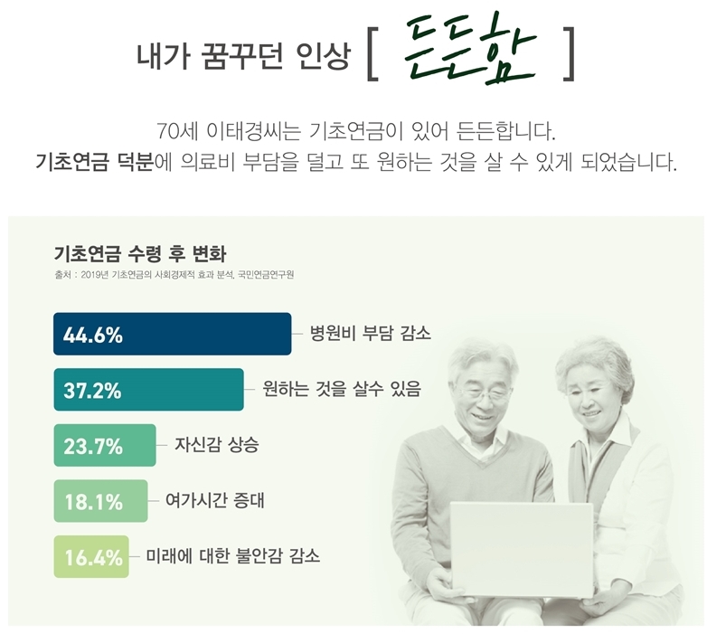 현재의 심각한 노인빈곤문제를 해결하면서, 미래세대의 부담을 덜어드리고 노후에 안정된 혜택을 누릴 수 있도록 기초연금 제도를 도입하게 되었습니다.